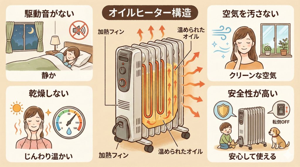 オイルヒーターはご覧の通り、音が出るような仕組みではありません。